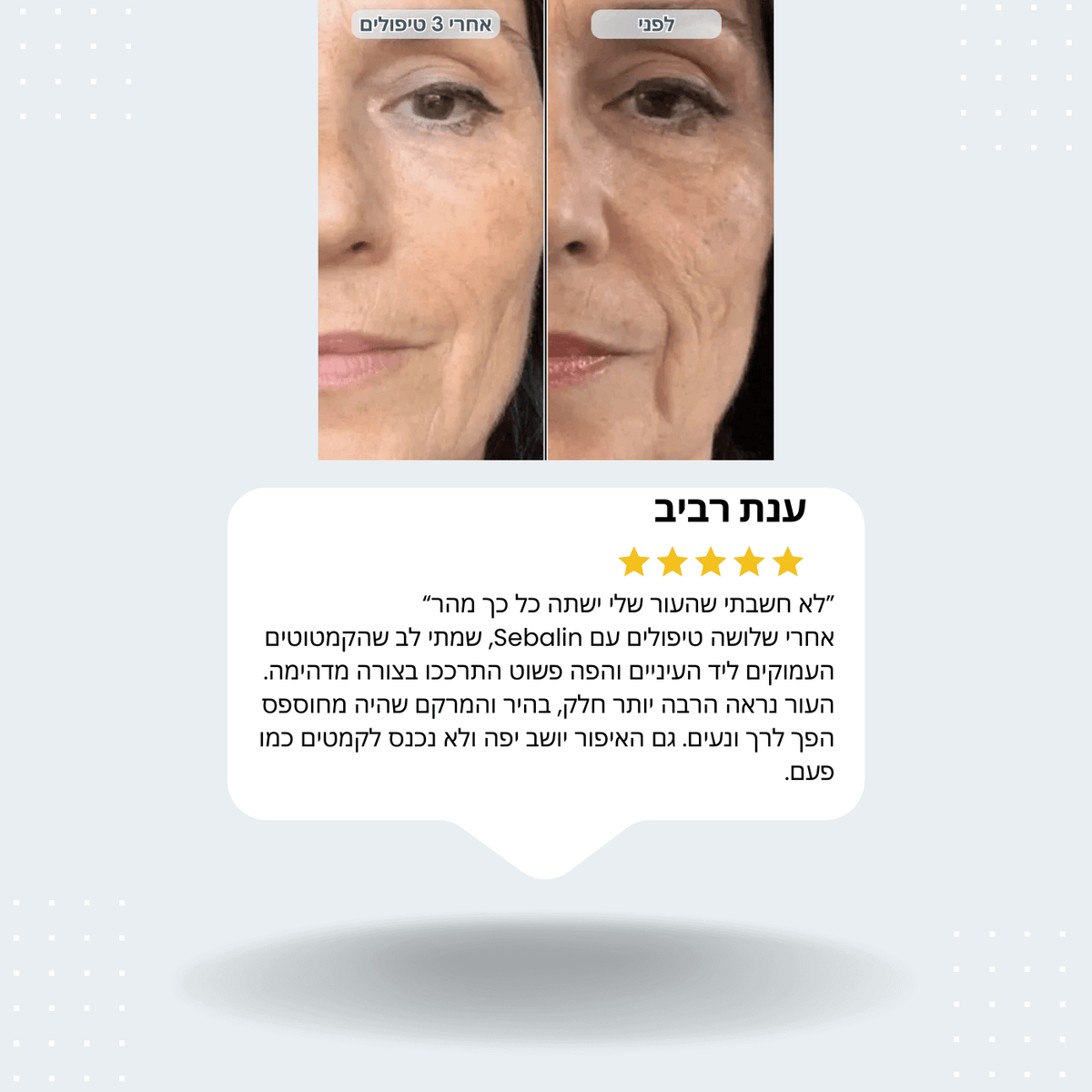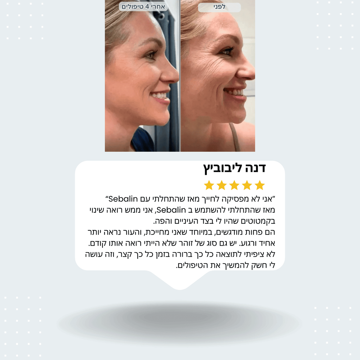 העור שלי נראה הרבה יותר חלק ושמתי לב לשיפור גדול במלאות שלו. אני בהחלט מקווה להזמין שוב. ניסיתי גם טיפולים בקליניקות, אבל Sebalin הרבה יותר טוב — אין מה להשוות בכלל. החומרים שלהם גם די כאבו לי, ואילו הטיפול שלכם לא כאב בכלל.