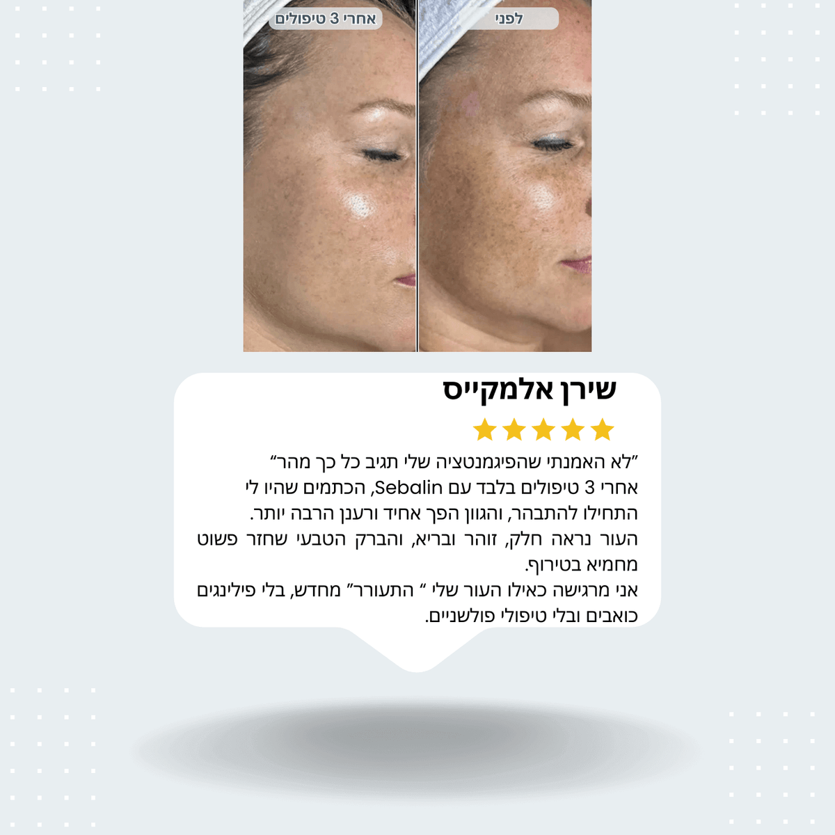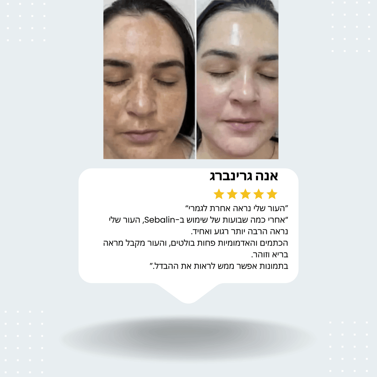 “אחרי שימוש ב-SEBALIN כחלק משגרת הטיפוח שלי, אני מרגישה שהעור נראה רענן ואחיד יותר. החוויה הייתה חיובית ואני ממשיכה להשתמש.”