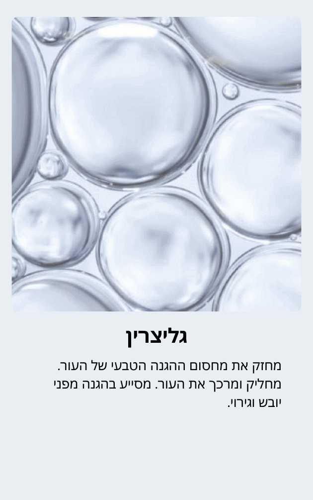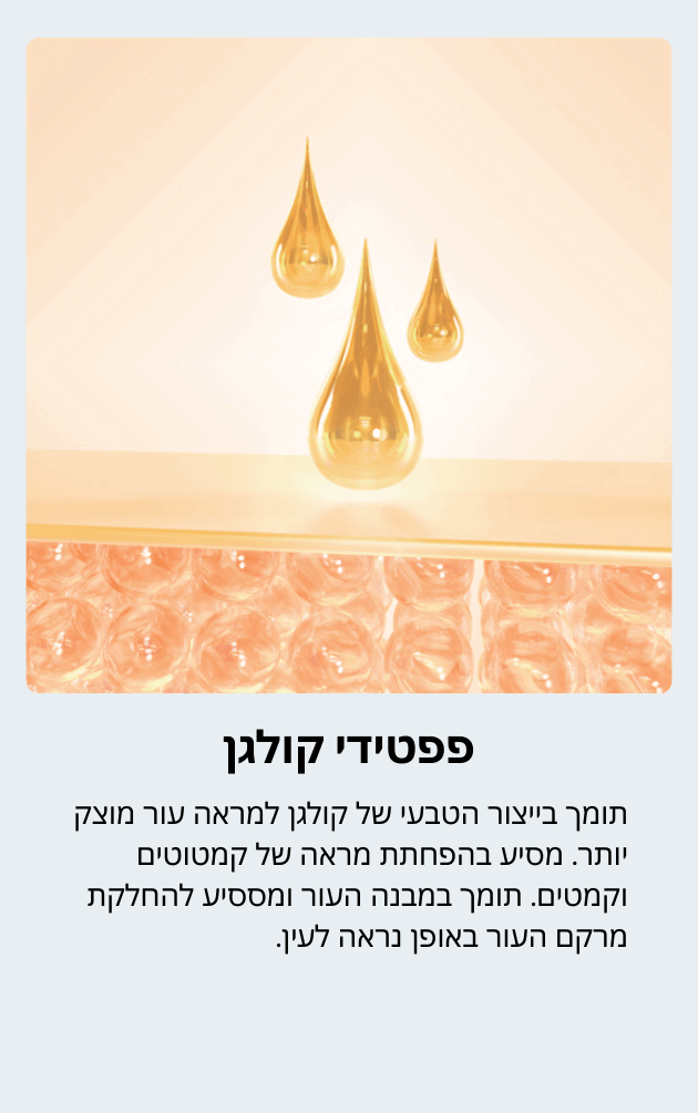 כך רכיבים פעילים כמו חומצה היאלורונית מזינה ופפטידים התומכים בהיווצרות קולגן מגיעים לשכבות עמוקות יותר בעור, ועוזרים לו להיראות חלק, מלא וזוהר יותר עם הזמן.