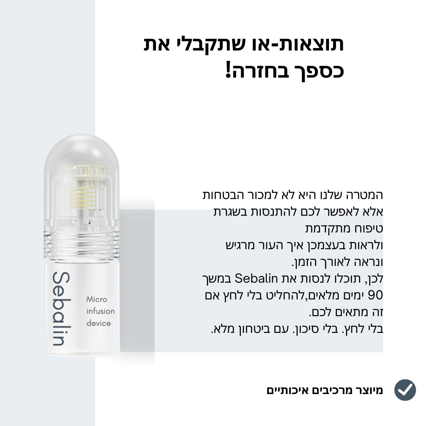 אנחנו כל כך בטוחים ב - SEBALIN – טיפול פנים מתקדם לעור הפנים, שאנחנו מתחייבים: אם לא תראו תוצאות, תקבלו את כספכם בחזרה.